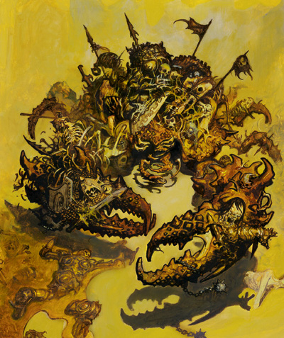 Muté par Les Terres des Lamentations, le Crabe Carcassier est un énorme crustacé couvert de cadavres, d'armes et armures abandonnées sur sa coquille extérieure. Alors qu'ils patrouillent principalement les terres_des_lamentations avec sa carapace camouflée, des Crabes Carcassiers ont été vus passant dans le Darguun et Valénar.