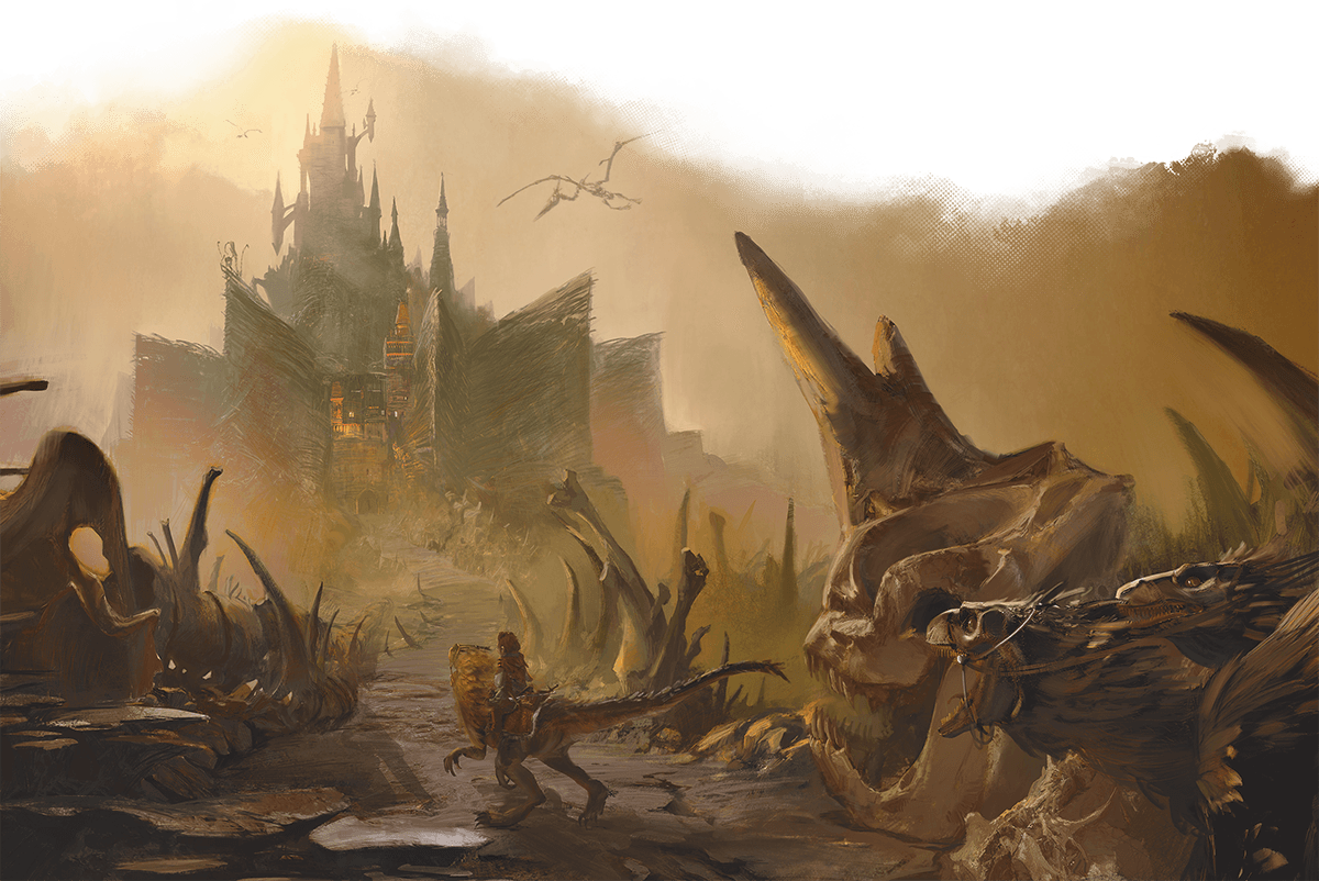 At first it’s just a white blot in the shimmering haze of the horizon. But as you approach, the blot resolves into a cluster of white stone buildings surrounded by a wall. You also see the first sign of Humain life for miles: armored soldiers walking along the top of the wall. You approach closer and see that your initial impressions were false in at least two respects: The figures shuffling along the top of the wall have a gait matched by no living Humain. And many of the white stones aren’t stones at all. They’re bones—Humain and otherwise.