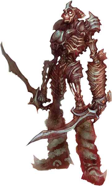 Bone knights are Karrn patriots, living protectors who fight alongside the Mort-vivant legions of their land. During the La Dernière Guerre, they provided tactical expertise and fine control to the legions of Mort-vivant Kaius raised to defend his people. In postwar Karrnath, they serve as elite knights who travel abroad to complete missions that serve the greater glory of their king. They wear suits of bonecraft armor that they craft themselves and learn to harness the power of necromancy, turning hordes of Mort-vivant into disciplined, even cunning, troops.