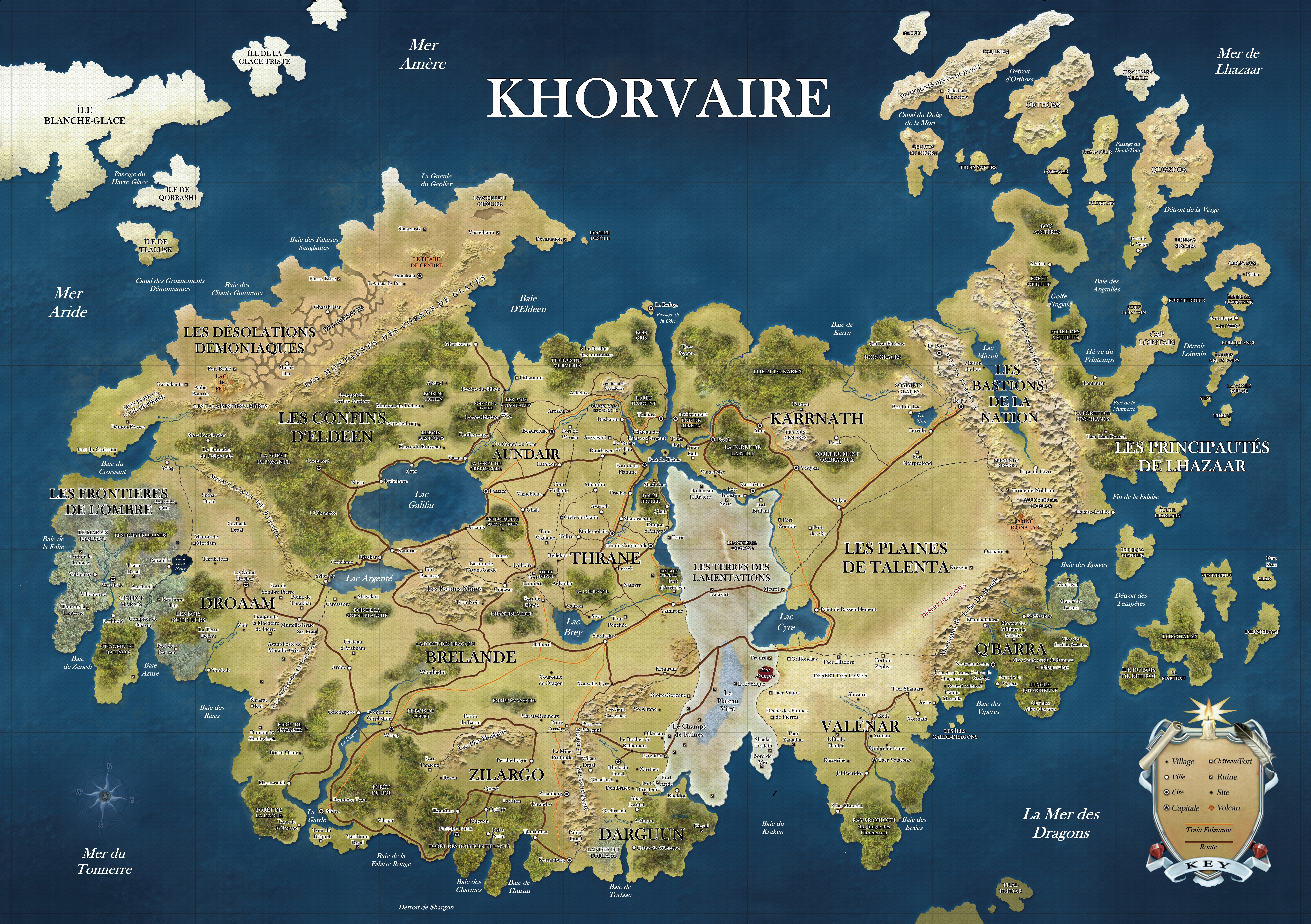 Khorvaire est un grand continent avec de nombreuses nations et régions autonomes. Les frontières de nombre de ces zones sont contestées, bien qu'elles aient été déterminées dans le Traité de Fort-du-Throne. Les principales nations et régions de Khorvaire sont: Aundair, Brelande, Karrnath, Thrane et Les Terres des Lamentations (anciennement Cyre).