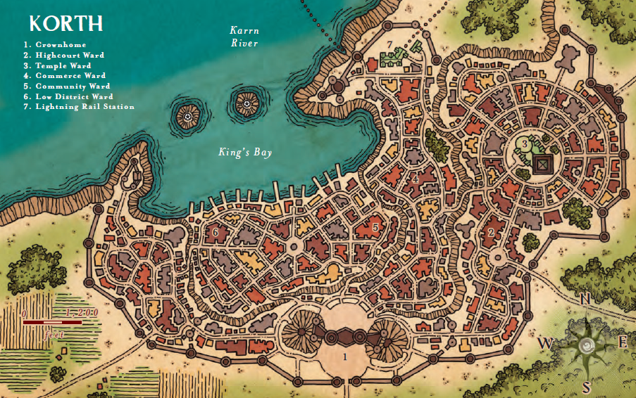 Each of Korth’s five wards has features of interest to adventurers, whether they seek an audience with the king or black-market identity papers.