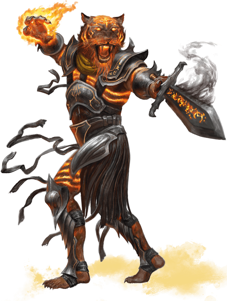 Mordakhesh l'Épée de l'Ombre is a dark-furred zakya rakshasa with stripes of fire. He often wears dark armor with a gorget of Dragon scales.