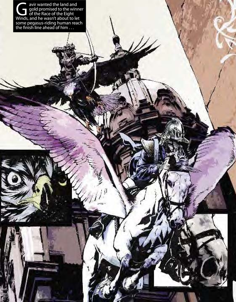 In addition to finances, the members of the Wind Guard engage in a never_ending series of schemes and negotiations on behalf of their region. Alliances and networks of favors stretch back for centuries, making the race as much a match of politics as of speed. The owl is one of the slowest creatures in the race, but the Bazaar has a powerful economic position and often uses bribery and graft to get ahead. The griffon rarely tries to win, instead using its physical power as a bargaining chip throughout the period between races; even if the griffon can't win, it can usually take another creature out of the race. Of course, it may be that the hawk owes a favor to the owl, and repays that favor by asking the griffon to cripple the pegasus — and this is a fairly simple example.