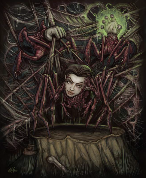 Like spiders they rely on webs to catch their prey, but as they cannot produce silk they instead use the entrails, skin and other body parts of their prey to weave them. To preserve their webs, they coat them in a sort of sticky mucus which also serves as a hallucinogenic, further ensnaring any creature entrapped within it. They live only in Kresht Rhyll, the Forest of Flesh, which was named such mostly due to their webs.