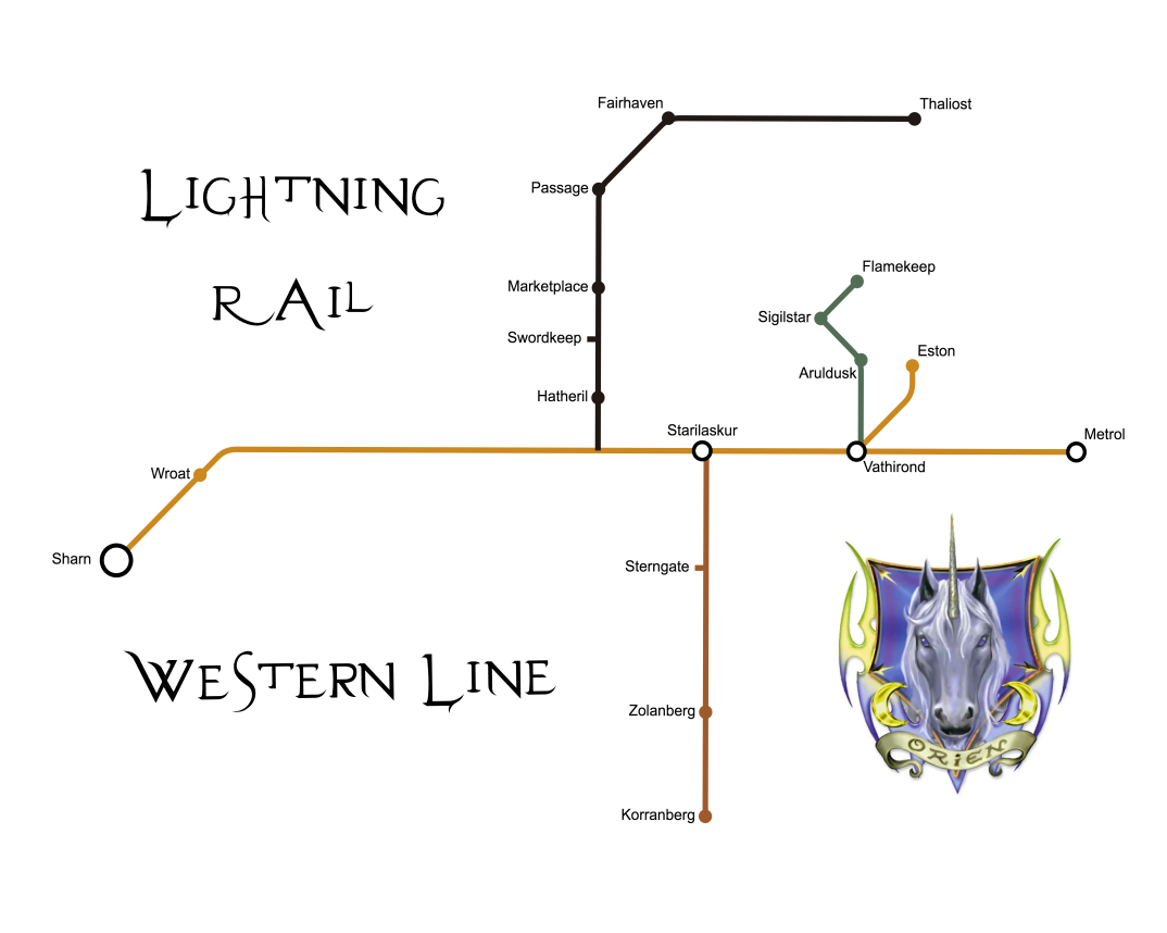 The Orléans operated Train Fulgurant is an international, magical train line connecting many of the major cities throughout Khorvaire. In many ways, the Train Fulgurant resembles and functions like trains of the Old West, but instead of following along rails, the Train Fulgurant follows a path of conductor stones. The conductor stones, magical creations of Bombardier, are placed along the ground forming a conduit of magical energy to allow the Train Fulgurant to travel at high speeds across Khorvaire. The Train Fulgurant itself is pushed along by an Élémentaire bound to the Train Fulgurant's coaches. The Train Fulgurant is given its name because of the crackling energy created when an Élémentaire-bound coach passes over a stone. However, it has no rails, nor did it ever have rails, so this part of the name is unexplained.